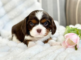 Allow us to introduce Hazel, our truly extraordinary chocolate tricolor Cavalier! She has a stunning chocolate coat and enchanting light eyes that make her stand out in any crowd. Hazel's playful and affectionate personality shines through, making her the perfect companion for all kinds of experiences, whether you're on adventures or enjoying cozy, relaxing evenings at home. Once you have the pleasure of meeting her, you’ll undoubtedly be charmed by her delightful spirit and will find yourself eager to create countless unforgettable memories together!