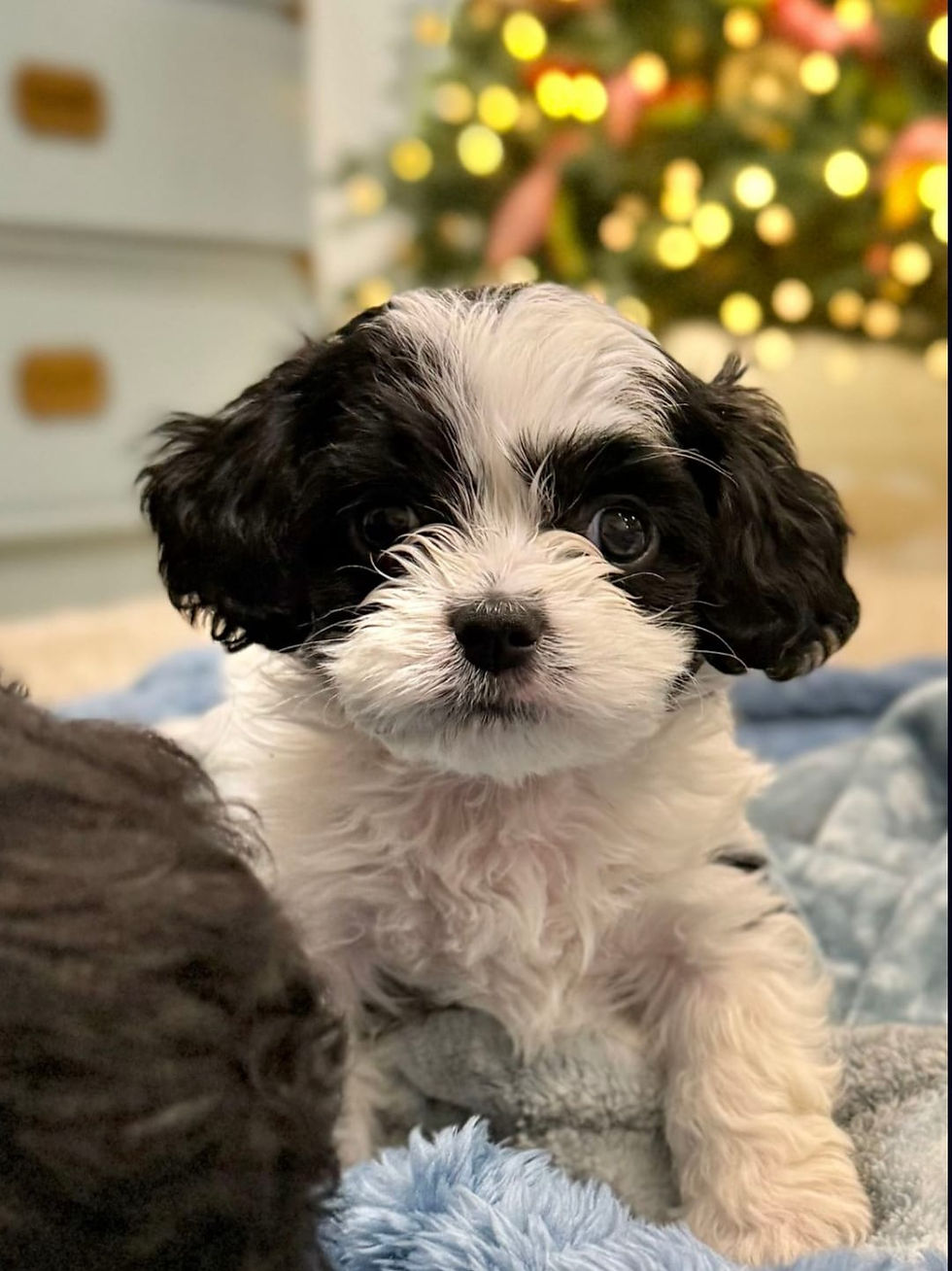 Are your kids singing, "All I want for Christmas is a puppy!"? Your wishes have come true because Snoopy, our adorable black and white male F1 Miniature Cavapoo, is ready to be delivered just in time to be placed under the tree by Santa!